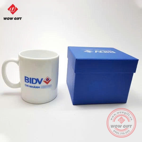 Cốc sứ in logo với chất lượng gốm sứ Bát Tràng, men sứ trắng, in logo nổi bật. Cốc sứ được đặt trong hộp xi xanh đựng quà, làm theo yêu cầu của khách hàng. Hộp xi có in logo doanh nghiệp nhằm tăng nhận diện thương hiệu và tăng thêm phần sang trọng.
